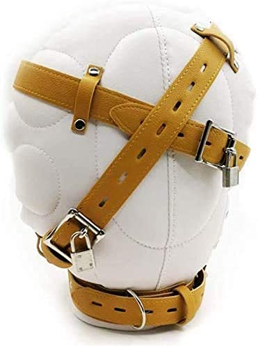 Zacht leren kostuum bondage kap, bevestigd door vetersysteem